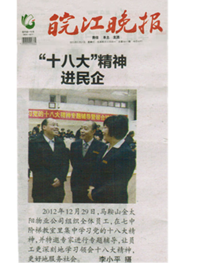 2013年1月2日的《皖江晚報(bào)》上就金太陽物業(yè)組織學(xué)習(xí)十八大精神輔導(dǎo)主題會(huì)進(jìn)行了報(bào)道,報(bào)道中說:2012年12月29日,馬鞍山市金太陽物業(yè)公司組織全體員工,在七中階梯教室里集中學(xué)習(xí)黨的十八大精神,并特邀專家進(jìn)行專題輔導(dǎo),讓員工更深刻地學(xué)習(xí)領(lǐng)會(huì)十八大精神,更好地服務(wù)社會(huì)。