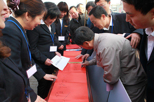 3月3日上午,“當(dāng)代雷鋒”郭明義來到馬鞍山,為郭明義愛心團隊馬鞍山分隊授旗。盡管行程很緊湊,但郭明義還是給金太陽物業(yè)公司義工社題字,并與董事長朱曉梅親切交談,表示應(yīng)當(dāng)將“當(dāng)代雷鋒”精神在鋼城繼續(xù),在金太陽物業(yè)公司義工社繼續(xù)。