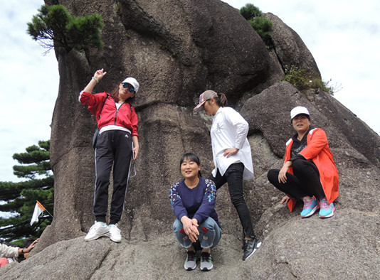 在下索道后,隊(duì)伍所有人立即被眼前美景所吸引,迫不及待掏出相機(jī)、手機(jī)互相攝影留念。在經(jīng)過短暫的停留與整頓后,旅行隊(duì)繼續(xù)前行,徒步經(jīng)蓮花峰、天都峰,以及“蓬萊三島”、“百步云梯”、“一線天”、“新一線天”、“鰲魚洞”等諸多景觀,歷時(shí)三個(gè)多小時(shí)攀爬,隊(duì)員們的體力基本已消耗殆盡,甚至個(gè)別隊(duì)員的腿部肌肉因疲勞酸痛而不由自主地發(fā)抖,然而在這種情形下,沒有金太陽人肯輕言放棄,只因心中還有目標(biāo),大家相互攙扶,彼此鼓勵(lì)著繼續(xù)前進(jìn),終于登上了海拔1841米的黃山玉屏景區(qū)的第一高峰——光明頂。