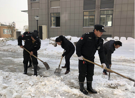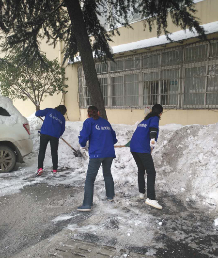 團(tuán)結(jié)就是力量,干凈的道路在腳下延伸。以上是“金太陽(yáng)”物業(yè)掃雪情景