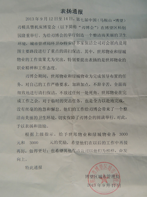 綠城勞務(wù)服務(wù)公司獲博望區(qū)城市管理局表揚(yáng)通報(bào)
