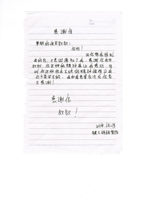 這是一封簡單,可以說是非常質(zhì)樸的感謝信。但其中卻包含了失主對于我們辛勤工作的安保人員乃至是對所有金太陽職工的精神的肯定和贊揚。我們將會秉持金太…