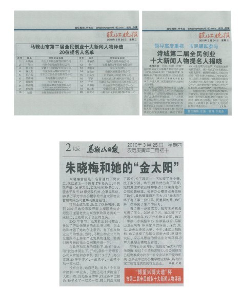 我公司朱曉梅總經(jīng)理成功進入馬鞍山市第二屆全名創(chuàng)業(yè)十大新聞人物評選的前20名,此報道刊登于2010年3月24日的皖江晚報,于此同時馬鞍山日報也對我們的總…